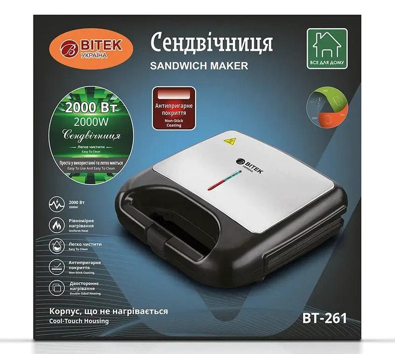Сэндвичница BITEK BT-261, 2000 Вт Сэндвичница BITEK BT-261 — это универсальный кухонный прибор, который объединяет функции вафельницы, гриля и устройства для приготовления сэндвичей. Благодаря высокой мощности в 2000 Вт и системе автоматического контроля температуры, прибор обеспечивает равномерное приготовление и вкусный результат при минимальных усилиях. Основные преимущества - Универсальность: приготовление сэндвичей, вафель и блюд на гриле - Мощность 2000 Вт — быстрый нагрев и приготовление - Антипригарное покрытие пластин — готовка без масла и жира, легкий уход - Автоматический контроль температуры для идеального результата - Термоизолированный корпус из пластика, безопасный при прикосновении - Индикаторы питания и готовности для удобного контроля - Ручка, которая не нагревается, и защитный замок для безопасного использования - Длина сетевого кабеля 0,7 м — удобно на кухне - Стильный и компактный дизайн Характеристики - Тип: сэндвичница - Питание: сеть 220 В - Мощность: 2000 Вт - Материал корпуса: пластик - Материал пластин: металл с антипригарным покрытием - Термоизолированный корпус: есть - Длина кабеля: 0,7 м - Количество форм: 1 (несъемная) - Индикатор питания: есть - Индикатор готовности: есть - Ручка, не нагревающаяся: есть - Защитный замок: есть Комплектация - Сэндвичница BITEK BT-261 - Инструкция