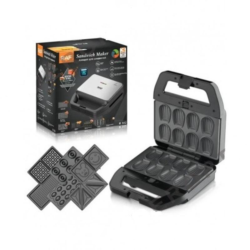 Мультимейкер 7в1 RAF R 552 для сендвичей орешков пончиков печенья толстых вафель кексов 800W Мультимейкер RAF R 552 – это универсальное качественное устройство, которое позволит вам приготовить большое количество блюд и не займет много места на Вашей кухне. Оно соединяет в себе 7 кухонных приборов: мультигриль, орешницу, сэндвичницу, вафельницу, аппарата для пончиков, кекса и печенья. Все это вы сможете сделать благодаря идущим в комплекте сменным формам. Данная модель очень удобна и проста в использовании, поэтому утром, когда совсем мало времени на завтрак, она не доставит особых хлопот в использовании. Мультимейкер поджаривает продукты сразу с двух сторон, причем они никогда не пригорят благодаря имеющейся антипригарной пластине. При работе прибор никогда не раскроется из-за системы блокировки корпуса. У этой модели хорошая термоизоляция как корпуса, так и ручки. Сама ручка достаточно широка и удобна для захвата рукой и перемещения прибора. Дизайн мультимейкера выполнен в классическом стиле серебристого цвета с черным, так что она наверняка впишется в любой кухонный интерьер. Характеристики: - Многофункциональность - 7 сменных пластин для разных блюд. - Антипригарное покрытие - Компактный размер - 220-240 В, 50-60 Гц, 800 Вт - Два индикатора питания и функция готовности - Легко использовать и чистить - Нескользящие ножки Комплектация: - Мультимейкер RAF R 552 - Сменные пластины 7 шт - Инструкция - Фирменная коробка