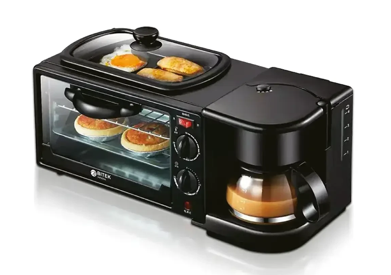 Электрическая печь настольная для кухни для выпечки с кофеваркой и сковородой гриль с крышкой 3в1 (машина для завтрака) BITEK – это удивительный маленький многофункциональный кухонный прибор, который может приготовить до 6 чашек кофе, тосты, выпекать, жарить или разогреть. даже использоваться для приготовления на сковороде! У вас когда-то было одно из тех напряженных ранков, когда все отстает, а времени даже не хватает, чтобы приготовить здоровый завтрак? Что ж, приготовитель завтрака Haeger “три в одном” решит эту проблему. Прибор сочетает в себе сразу три функции: Кофеварка с чашей. Подготавливает до 6 чашек одновременно за считанные минуты, поэтому вы можете наслаждаться чашечкой кофе, пока готовится еда. Многофункциональная печь. Оснащена 30-минутным таймером со стеклянными дверцами и может вместить до 4 ломтиков хлеба, 7-дюймовую пиццу и может использоваться для приготовления запеканок, печенья и других вкусных блюд. Сковорода с антипригарным покрытием. Предлагает много места для жарки яиц, омлетов, блинов, колбас, бекона и других продуктов для завтрака – и поставляется со стеклянной крышкой. Характеристики: Мощность: 3600Вт Объем духовки: 9 л Напруга: 220-240В, 50-60Гц Таймер: 30 минут Регулировка температуры до 230°C Емкость кофеварки: 6 чашек