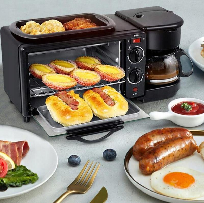 Электрическая печь настольная для кухни для выпекания с кофеваркой и сковородой гриль с крышкой 3в1 (машина для завтрака) Domotec MS 5308B - это удивительный маленький многофункциональный кухонный прибор, который может приготовить до 6 чашек кофе, и даже использоваться для приготовления на сковороде! Прибор сочетает в себе сразу три функции: Кофеварка с чашей. Готовит до 6 чашек одновременно за считанные минуты, так что вы можете наслаждаться чашечкой кофе, пока готовится еда. Многофункциональная печь. Оснащена 30-минутным таймером со стеклянной дверцей и может вместить до 4 ломтиков хлеба, 7-дюймовую пиццу и может использоваться для приготовления запеканок, печенья и других вкусных блюд. Сковорода с антипригарным покрытием. Предлагает много места для жарки яиц, омлетов, блинов, колбас, бекона и других продуктов для завтрака - и поставляется со стеклянной крышкой. Характеристики: Мощность: 1050 Вт Объем духовки: 9 л. Объем кофеварки: 500 мл (6 чашек) Таймер: 0 - 30 минут Регулировка температуры: 100 - 230 °C Вес: 4 кг Цвет: красный и черный Комплектация: Электрическая печь духовка 3 в 1 Инструкция Фирменная упаковка