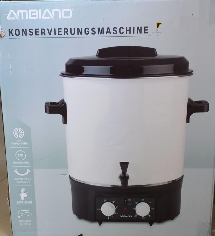 Прибор для консервирования Ambiano новый консервирующий прибор, который может использоваться для консервирования фруктов и овощей. также можно использовать как устройство для подогрева таких напитков, как глинтвейн, как какао и чай. Напитки можно легко разливать с помощью практичного крана. Устройство для консервирования работает с мощностью 1800 Вт через сеть питания и предлагает емкость для консервирования. Управление осуществляется с помощью двух поворотных регуляторов на передней панели. Температуру можно установить до 100 градусов Цельсия, а время работы таймера — до 120 минут. Рабочее состояние отображается световым индикатором. Объем салона составляет 27 литров. Есть две ручки для транспортировки машины. Характеристики и описание