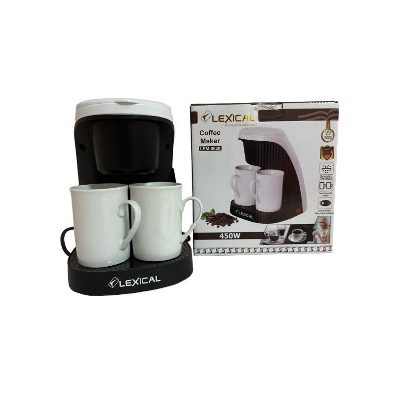 Кавоварка Lexical, електрична. Можливість приготування двох порцій кави одночасно. Комплектація - дві керамічні чашки та мірна ложка. Об'єм - 300 мл. Потужність - 450 Вт. Тип кави, що використовується – мелена. Матеріал - пластик. Фільтр - знімний, багаторазовий. Живлення - мережа 220-240 В, 50-60 Гц. Упаковка - коробка.