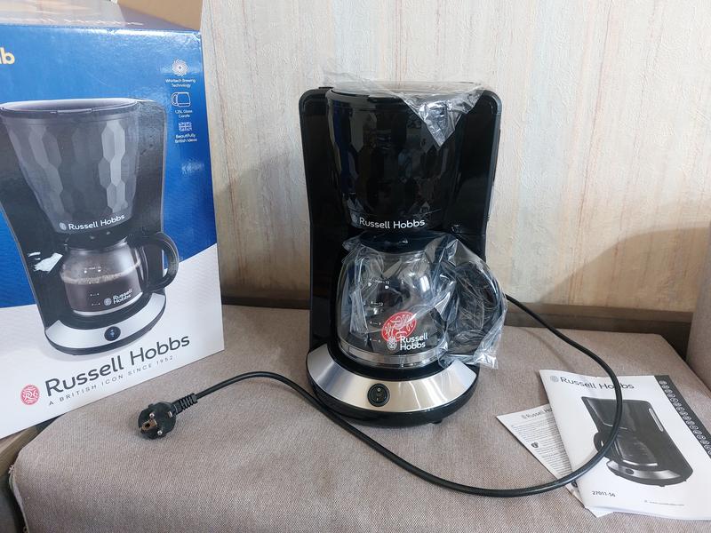 Крапельна кофеварка кавоварка RUSSELL HOBBS 27010-56 Honeycomb Новая, только изогнутая из коробки для фото Особенности капельной кофеварки Russell Hobbs 27010-56 Honeycomb: Кофеварка из фактурного пластика премиум-класса с полированными вставками; Технология заваривания Whirl Tech обеспечивает равномерное распределение воды для максимального вкуса кофе; Стеклянный графин емкостью 1.25 л – для большой компании; Стоп-кадр и заливка; Пластиковые детали кофеварки без содержания BPA; Яркая синяя подсветка; Подходят одноразовые фильтры No4 (в комплект не входят); Мерная ложка на одну чашку; Съемный держатель фильтра;