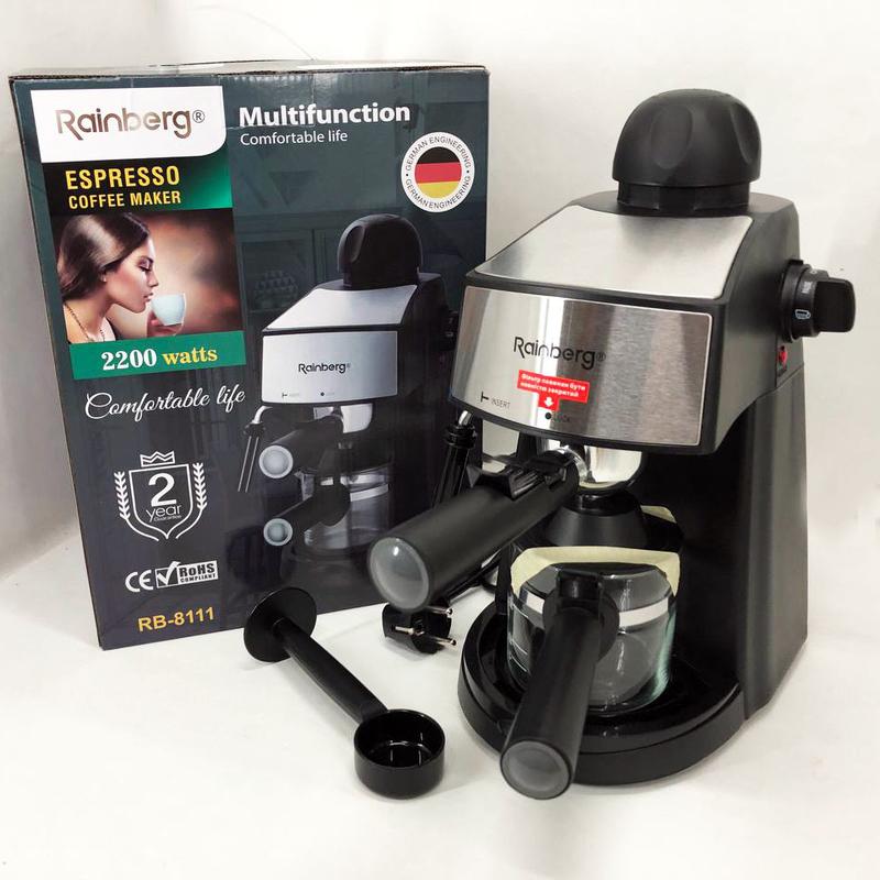 Кофемашина Rainberg RB-8111 -- современный кухонный прибор для быстрого приготовления кофе. По своим техническим характеристикам устройство максимально схоже с профессиональными кофемашинами. Прочный и стильный корпус. Данная модель предназначена для приготовления классического кофе, а также кофейных напитков с молоком и молочной пеной: Благодаря функции вспенивания молока вы сможете приготовить популярный итальянский напиток капучино. Вращая специальный регулятор на приборе, определяйте количество молочной пены в кофе на свой вкус. Данный кухонный прибор поможет приготовить и другие напитки на основе кофе. Например, вы сможете сделать американо, добавив в порцию эспрессо немного горячей воды. Или побаловать себя кофе с мороженым, ликером, корицей. Особенности: - Простота в использовании: налейте воду, по своему вкусу, с помощью мерной ложки добавьте кофе и просто включите; - Компактность и удобство: Прочный стальной корпус не требует особых усилий по уходу, достаточно просто протереть его тряпочкой. Все капельки воды, с только что помытой кружки будут стекать на специальный поддон; - Режимы работы: эспрессо, капучино; - Защита от перегрева; - Индикатор. Характеристики: - Кофеварка: эспрессо - Мощность: 2200W - Давление пара: 3,5 бар - Мерная ложка: 21 г - Тип используемого кофе: Молотый; - Тип управления: Механическое; - Номинальное напряжение: 220 В; - Съемная насадка для вспенивания и поддон для легкой очистки - Режимы работы: эспрессо, капучино - Защита от перегрева - Габариты: 33*16*24 см - Индикатор Комплектация: 1. Кофеварка Rainberg RB-8111 2. Мерная ложка 3. Упаковка: коробка