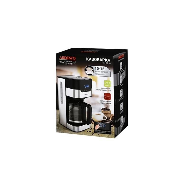 Капельная кофеварка ARDESTO FCM-D3100 для молотого кофе с мощностью 900 Вт, таймером приготовления, подогревом кофейника и выбором крепости напитка. Премиальный дизайн Корпус кофеварки выполнен из прочного глянцевого черного пластика и вставок из шлифованной нержавеющей стали. На лицевой панели расположен сенсорный блок управления. Дисплей получил подсветку синего цвета. Внутренний резервуар для воды с индикатором рассчитан на 1,5 л. Прозрачный кофейник также вмещает 1,5 л и выполнен из боросиликатного стекла. Для поддержания температуры напитка после приготовления, в нише для кофейника, расположен нагревательный диск с антипригарным покрытием. Многоразовый фильтр Кофеварка комплектуется съемным многоразовым фильтром для молотого кофе и чая. Конструкция фильтра обеспечивает легкое и быстрое очищение кофеварки после использования. Электронное управление Кофеварка оснащена удобной сенсорной панелью управления со встроенным дисплеем, часами, таймером приготовления и поддерживает выбор крепости напитка. Автоотключение кофеварки происходит через 2 часа после приготовления.
