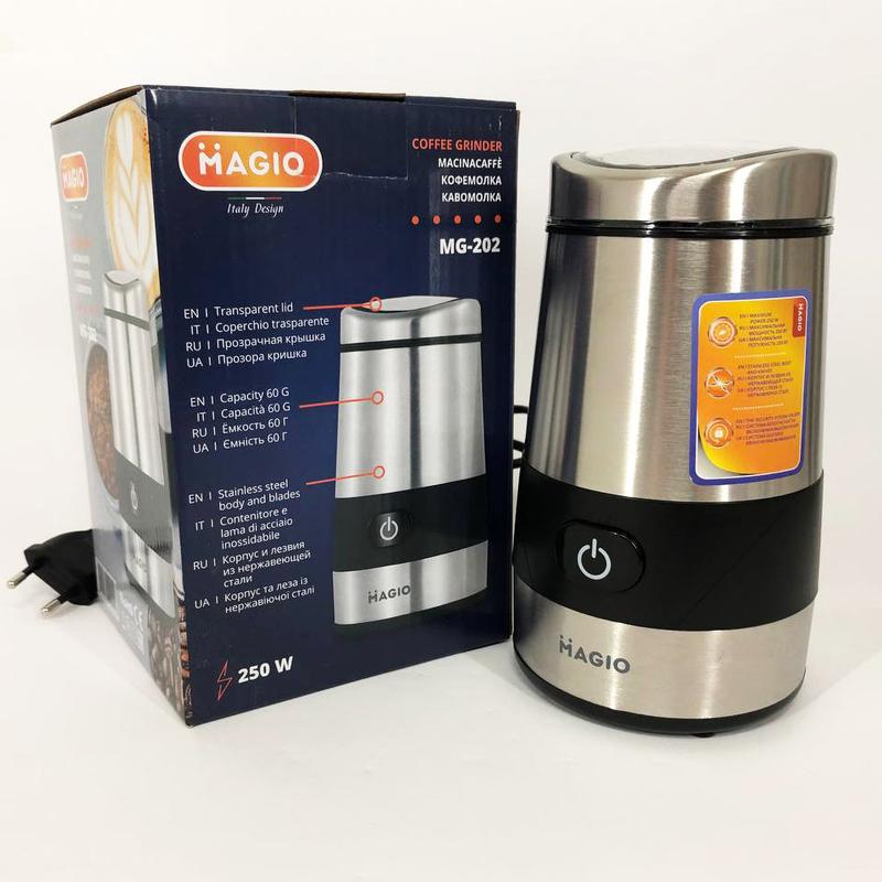Кофемолка Magio МG-202 за один раз измельчает 60 грамм кофе. Этого вам будет достаточно, чтобы наслаждаться в кругу семьи или близких друзей ароматом свежего кофе каждый день. Особенности модели: - Мощность: 250 Вт; - Объем: 60 г; - Материал ножа и корпуса: нержавеющая сталь; - Прозрачная крышка; - Система безопасности -- эксплуатация возможна только с закрытой крышкой; - Отсек для хранения шнура;