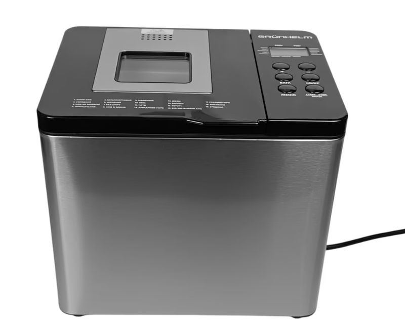 Основные характеристики Потребляемая мощность, (Вт) 550 Вт Максимальный вес выпечки 750 г Материал корпуса Нержавеющая сталь Пластик Количество программ 19 Замес теста Так Выбор цвета корочки Так Особенности Дисплей Таймер отсрочки старта Смотровое окно Комплектация Хлебопечка Форма для выпечки Мерная ложка Лопатка для замешивания Крючок для извлечения формы Инструкция Гарантийный талон Габариты (ВхШхГ) 26 х 28 х 23 см Цвет производителя Серебристый с черным Вес 5,3 кг Гарантийный срок 1 год Бренд Grunhelm