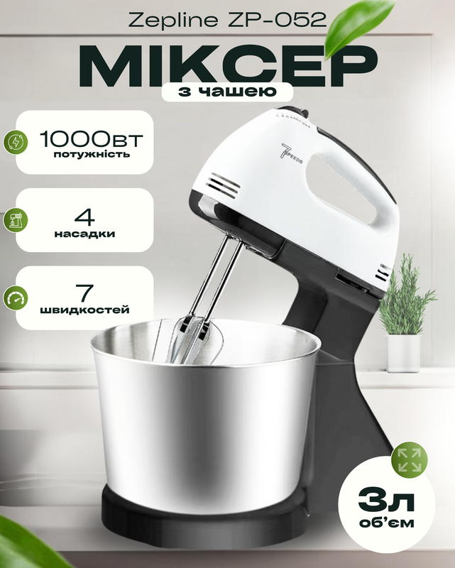 Миксер с металлической чашей на 3 л Zepline ZP-052 из 7 скоростей помогут Вам взбить все быстро и без комочков. Прибор очень удобный, легкий в использовании и чистке, который помогает готовить Ваши любимые блюда; * Материал: пластик; * Материал насадок: нержавеющая сталь; * Объем чаши: 2 л.; * Количество насадок: 4 шт.; * Переключатель скоростей: 7; * Питание: 220 Ст; * Мощность: 1000 w. * Комплектация: Миксер – 1 шт.; * Чаша – 1 шт; * Насадки для взбивания: 2 шт.; ; * Насадки для тесту: 2шт.; * Подставка - 1 шт. * Упаковка: заводская коробка.