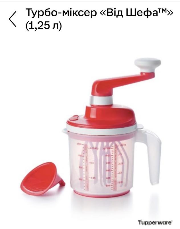 Турбо-міксер «Від Шефа™» призначений для збивання різних сумішей: яєчних білків, вершків, рідкого тіста, соусів без використання електрики. Турбо-міксер має оптимальне поєднання довгої ручки та рукоятки для зручного використання. Ергономічна кришка із високою посадкою для скорочення навантаження на руки. Ручка та носик на підставі дозволяють легко переливати вміст. Мірна шкала допомагає при приготуванні рецептів. Протиковзне кільце на дні основи забезпечує стійкість виробу. Перемикач швидкостей дозволяє переключити з першої швидкості на другу просто повернувши важіль. Маркування швидкостей знаходиться безпосередньо під важелем перемикання. Шість супершвидкісних віночків забезпечують швидке та бездоганне збивання інгредієнтів. На першій швидкості можна збивати рідкі, легкі суміші та яєчні білки. На другій швидкості віночки крутяться повільніше, ніж на першій, не вимагають великих зусиль при змішуванні та збиванні. Другу швидкість слід використовувати при приготуванні густіших сумішей, тіста з додаванням борошна, і коли суміш при збиванні на першій швидкості стає дуже густою. За допомогою вирви можна поступово додавати невелику кількість інгредієнтів під час збивання.