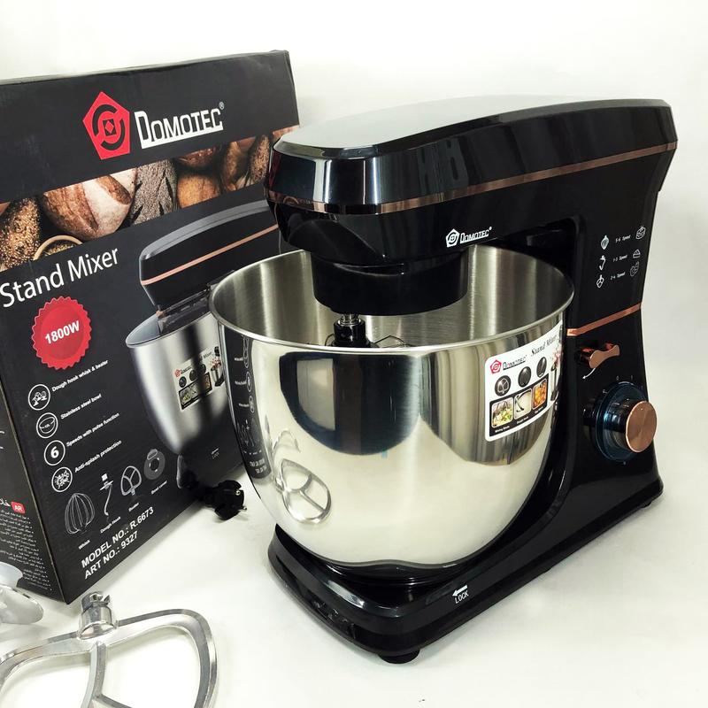 Настольный миксер Domotec R 6673 это многофункциональный помощник на кухне. Сочетает в себе функции миксера, блендера и кухонного комбайна, что делает его незаменимым инструментом для приготовления разнообразных блюд. Объем чаши миксера составляет 12 литров, что позволяет приготовить большое количество пищи за один раз. Это особенно удобно для тех, кто любит готовить большие порции или часто принимает гостей. Миксер оснащен тремя насадками: венчик для взбивания, крюк для замешивания теста и блендер для измельчения и смешивания продуктов. Это позволяет вам с легкостью приготовить разные блюда, от воздушных кремов до густого теста для выпечки. Выполнен в стильном дизайне, который легко впишется в интерьер любой кухни. Благодаря компактным размерам он не займет много места на вашей рабочей поверхности. Характеристики: - Тип: планетарный: стационарный - Вращение чаши - Защитная крышка на чашу - Кнопка отсоединения насадок - Мощность: 1800 Вт - Число скоростей: 6 - Режимы и функции: импульсный режим - Количество насадок: 4 - Материал корпуса: пластик - Материал чаши: нержавеющая сталь. - Объем чаши: 12 л - Универсальный измельчитель: есть - Длина сетевого шнура: 1 м - Вес: 5 кг Комплектация: - Миксер - Венчик для взбивания - Крючки для замешивания теста - Колотушка - Крышка чаши
