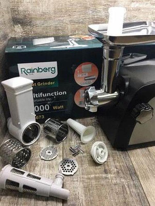 М'ясорубка Rainberg RB-673 3000W - Це ваш надійний напарник і помічник на кухні. Для приготування порції домашньої фарші з м’яса, овочів, риби та грибів — це тип електричної м’яса, яку використовують у китайській фірмі Rainberg. Цей пристрій оснащений додатковими насадками і пристосуваннями, що дає чудову можливість використання моделі RB-673 Для приготування домашніх ковбас і печиво. Сила електричного двигуна 3000 Вт з легкістю справиться з більшістю різноманітних завдань. Модель складається з набори корисних аксесуарів: змінні металеві сітки для фаршу різного діаметру: 3, 5, 7 мм, допоможуть готувати смачний і соковитий домашній фарш різних ступенів консистенції. Стильний корпус з нержавіючого металу і міцного пластику надає зовнішньому вигляду сучасного та елегантного вигляду. М'ясорубка Rainberg RB-673 Оприлюднюється функцією зворотного ходу шнека. Це дозволить вивільнити затверділі м’ясні рештки у шниковій камері, а також видобути наситючі жилети, хрящі та дрібні кісточки. Товар поставляється в заводській картонній коробці. Переваги: Низький рівень шуму; Висока продуктивність. Функція « реєрерс »; Висока можливість. Сучасний дизайн. Характерики: Потужність 3000 Вт; Система реверса; Захист двигуна від перезавантаження; Тричний металевий шнек; Резінові ніжки для додаткової стійкості; 3 насадки з дірками різного діаметра (3m, 5mm, 7mm); 2 ножа з нержавіючою сталі; Насадка для соку; Насадка "кеббе" для приготування домашньої ковбаси; Металічний лоток для продуктів. Комплектація: М'ясорубка. Решітки - 3 шт. Лезовия - 2 шт. Насадки - 2 шт. Інструкція. Упаковка.
