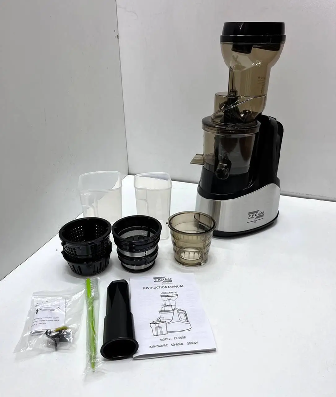 В комплекте есть три сменные насадки: Насадка для приготовления мороженого – идеально подходит для создания натурального домашнего десерта без лишних консервантов. Комбинированная насадка – для измельчения мягких и твердых фруктов и овощей. Данное устройство позволяет легко получать сок из цитрусовых, яблок, моркови, свеклы, зеленых овощей, ягод и даже орехов. Обозначение: Соковыжималка Zepline ZP-6058 предназначена для приготовления свежих соков, фруктовых и овощных полос, замороженных десертов и измельчения продуктов. Это отличный выбор для любителей здорового образа жизни, семей с детьми, а также для тех, кто ценит качество и вкус натуральных продуктов. Преимущества: 3 в 1: скискатель, мороженое, измельчитель Большой 75-мм загрузочное отверстие – позволяет закладывать целые фрукты и овощи Мощный двигатель 3000 Вт – обеспечивает быструю и эффективную обработку продуктов кове управления – удобная система включения/выключения металлическими вставками – идеально впишется в любой кухонный интерьер Легкое очищение