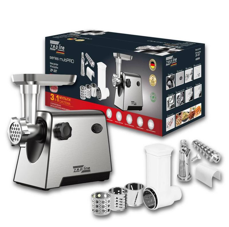 ОСНОВНИЙ ОПИС І ХАРАКТЕРИСТИКА ТОВАРУ: потужність 4000 Вт; система реверсу; захист двигуна від перезавантаження; міцний металевий шнек; гумові ніжки для додаткової стійкості; ніж із неіржавкої сталі; насадка для соку; насадка шатківниця - 4 шт; насадка «куббе» для приготування домашньої ковбаси; Корпус - неіржавна сталь; металевий лоток для продуктів.