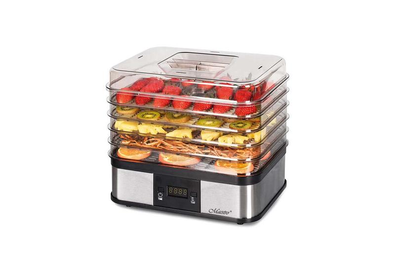 Сушилка для овощей, фруктов и ягод 767-MR от ТМ Maestro – простая, экономичная и надежная помощница на кухне. За счет конвекции устройство имеет очень эффективный теплообмен. Особенности конвекции препятствуют смешиванию запахов, если вы сушите разные продукты одновременно. Для каждого продукта найдется свой оптимальный режим температуры. Регулировка температуры от 40 до 70°C. Переключение режимов осуществляется с помощью надежного и наглядного электронного управления. Все лотки изготовлены из экологичного пищевого пластика, который в процессе работы не выделяет вредных веществ. Кроме того, пластик обладает повышенной стойкостью к ударам и царапинам.
