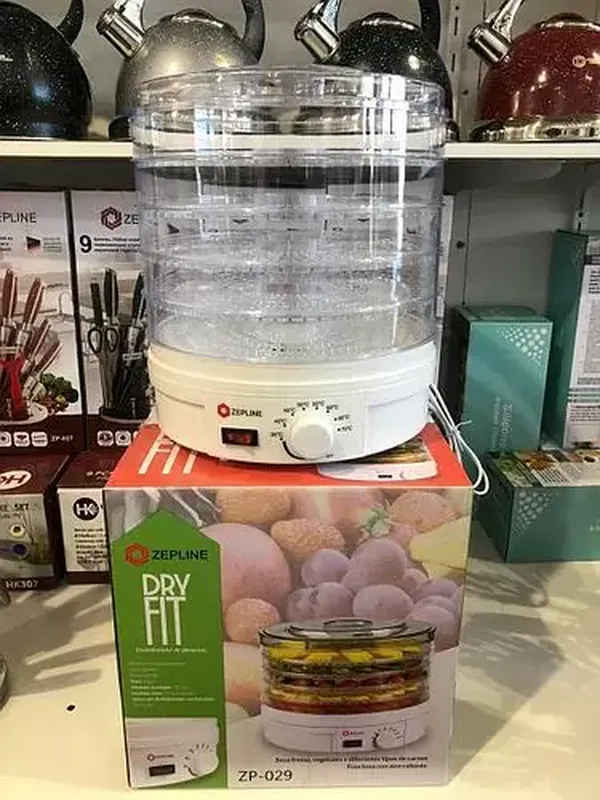 Сушилки для овощей и фруктов дегидратор.Zepline 029 электрическая 800W 5 секций. Вы можете использовать ее для высушивания фруктов, овощей, грибов, ягод и лекарственных трав, которые сохранят максимум полезных свойств. Прочный пластиковый корпус и наличие пяти секций для размещения продуктов делают ее эффективной и надежной в работе. Прозрачная крышка позволяет следить за процессом высушивания. Преимущества: Возможность регулировки температуры сушки; Функция вентилятора; Пластиковые поддоны выдерживают нагрузку до 1 кг; Равномерное распределение прогрева по всем поддонам. Характеристики: Мощность: 450 Вт пиковая мощность 800W; Питание: сеть 220-240V/50-60Hz; Диапазон температур: 35-70°C; Защита от перегрева: да; Количество уровней сушки: 5; Загрузка: до 1 кг на поддон; Материал: пищевой пластик, металл; Длина кабеля питания: 1 м; Размеры без поддонов (Д/В): 26.5x12 см; Габарити 23х32х32 см Вес: 2.5 кг. Комплектация: Сушилка для овощей и фруктов. Прозрачная крышка. Пять съемных пластиковых поддонов. Инструкция Заводская картонная упаковка.