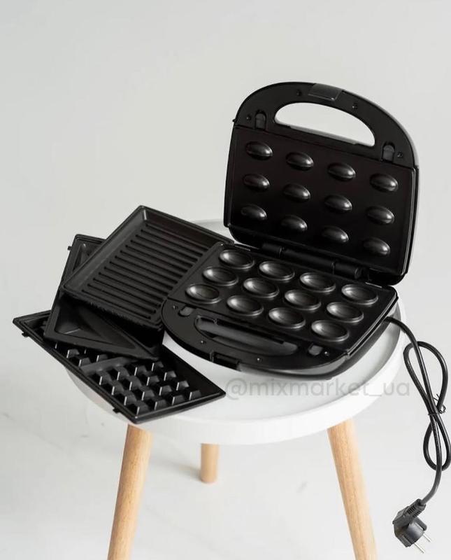Мультипекарь 4 в 1 Domotec MS 7704 Бутербродница Сэндвичница Domotec MS 7704 мощностью 1000 Вт, имеет 4 разные сменные пластины. Орешки 12шт, Гриль, Большие вафли (бельгийские), Сендвичница треугольная. Насадки легко устанавливаются и снимаются одним движением. Покрытие насадок антипригарное. На ручке расположен замок, который фиксирует две половины сэндвичницы.