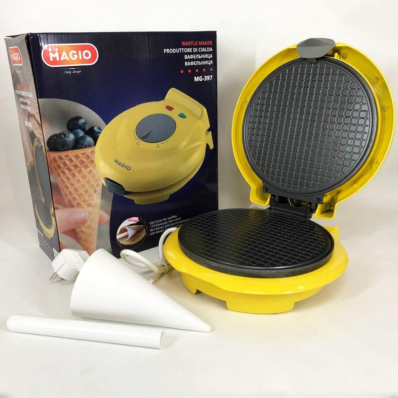 Вафельница Magio MG 397 поможет быстро и без хлопот вкусные и ароматные вафли на завтрак. Мощность нагревательного элемента 750 Вт обеспечит быстрое и равномерное нагревание металлических пластин круглой формы. Рабочая поверхность с антипригарным покрытием предназначена для выпечки тонких вафель. Чтобы насладиться любимым блюдом, достаточно приготовить тесто и разлить его в форму на несколько минут. Вафельница безопасна в пользовании, ведь при приготовлении ручка не нагревается. Корпус оснащен световыми индикаторами питания и готовностью к работе, что облегчает контроль процесса приготовления. Входящий в комплект конс поможет при приготовлении рожков. Magio MG 397 – современная и стильная вафельница желтого с серым цветом, которая прекрасно впишется в интерьер Вашей кухни.