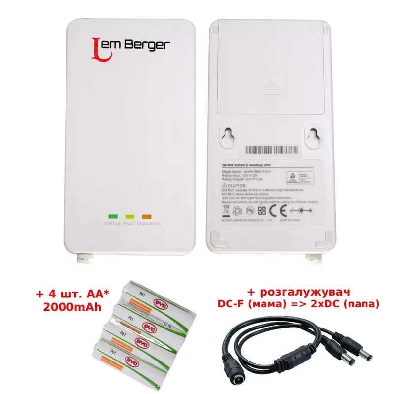 4 аккумуляторные батареи емкостью 2000 мАч каждая уже входят в комплект. Данное устройство имеет встроенный разъем DC, предназначенный для подключения внешнего источника питания, и встроенный кабель длиной 50 см со стандартным штекером DC. При отключении электросети, этот мини-UPS автоматически переключится на питание от аккумуляторов. Для внешнего питания целесообразно использовать блок питания с параметрами 12В/2А и стандартным разъемом с диаметром 5.5x2.1 мм. Можно использовать штатные блоки питания роутеров (камеры, коммутаторы и т.д.), если они подают напряжение 12 В и ток не более 2,5А. Для полноценной работы в автоматическом режиме (заряд/разряд) рекомендуем использовать вместо штатного блока питания к роутеру более мощный блок питания на 2-2,5А. Mini UPS Lem Berger BBU15-DT совместим с разнообразными устройствами, такими как роутеры, коммутаторы, IP-камеры и т.д., которые работают с напряжением 12В. Он идеально подходит для использования в качестве источника питания для абонентских терминалов оптических сетей GPON/EPON ONT и WiFi роутеров, 4G LTE роутеров и мобильных точек доступа Wi-Fi. Для удобства пользования этот мини UPS оснащено световыми индикаторами работы. Зеленый индикаторрея сигнализирует, что устройство работает и является внешнее питание от сети (или павербанка). Желтый индикатор chg/dischg означает, что аккумуляторы задействованы и заряжаются при наличии сетевого питания или разрядятся, когда питание отодвинется и подключено устройство (роутер, маршрутизатор и т.д.) питается именно от аккумуляторов. Красный индикатор fault загорается, когда аккумуляторы полностью разрядились, а сетевое питание при этом отсутствует. При появлении сетевого питания красный индикатор будет мигать, пока аккумуляторы не подзарядятся (обычно до 5 минут), после чего потухнет; если индикатор долгое время не гаснет – это может служить о выходе из строя самих аккумуляторов, и их следует заменить на новые. Входящее напряжение/ток: 12В/2А Длина кабеля: 50 см Аккумуляторные батареи: 4 шт.*АА Емкость одного аккумулятора: 2000 мАч Длина кабеля разветвителя: 32 см (без штекеров)