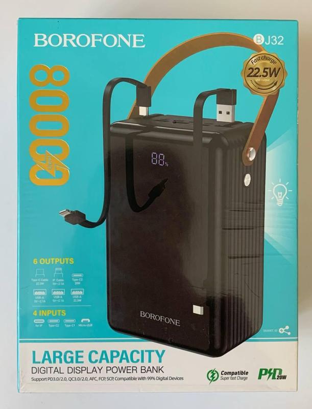 Преимущества данного Power Bank: Данная модель имеет большую емкость - 80000 mAh и длительный период сохранения заряда Емкий заряд батареи, который позволит многократно заряжать ваши гаджеты Наличие 3 USB портов и 2 Type-C для зарядки ваших гаджетов Цифровой LED индикатор уровня заряда (активация кнопкой), вы можете проверить уровень заряда в любое время Многоуровневая защита от замыканий и перегревов обеспечивает безопасную зарядку Огнеупорные материалы, из которых изготовлен PowerBank Батарея: долговечная и энергоэффективная A + полимерная батарея Возможность заряжать Повербанк через разъемы MicroUSB / Type-C / Lightning В комплекте кабели USB-Type-C и Type-C-Lightning Характеристики: Бренд: BOROFONE Модель: BJ32 Емкость: 80000 mAh, 3.7 V, 296Wh Тип аккумулятора: Polymer Входные интерфейсы: Lightning / USB Type-C / micro USB Вход: Micro-USB: 5V-2A макс; Type-C: 5V-2.4A макс, (10 Вт), Lightning (Apple) Количество USB выходов: 4 Максимальная мощность на выходе 1, 2, 3, 4: DC5V / 2A (3A макс) Время зарядки: от 20 ч (5V, 2A) Материал корпуса: ABS пластик Цвет: Черный Размер: 165 x 108 x 70 мм Вес: 1624 г