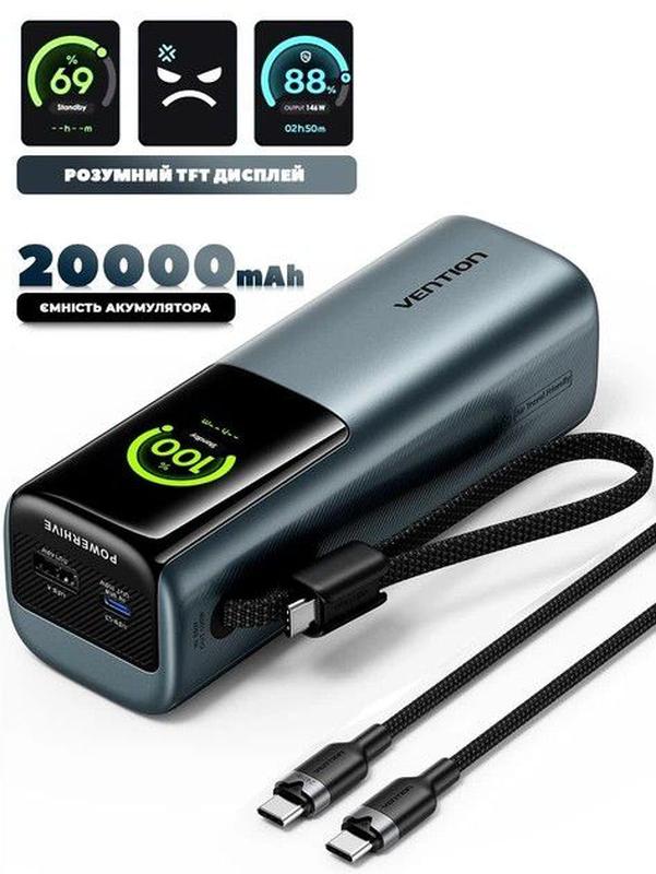 Павербанк vention 165w, 20000 mah, кабель type-c, smart дисплей, акб, батарея, powerbank