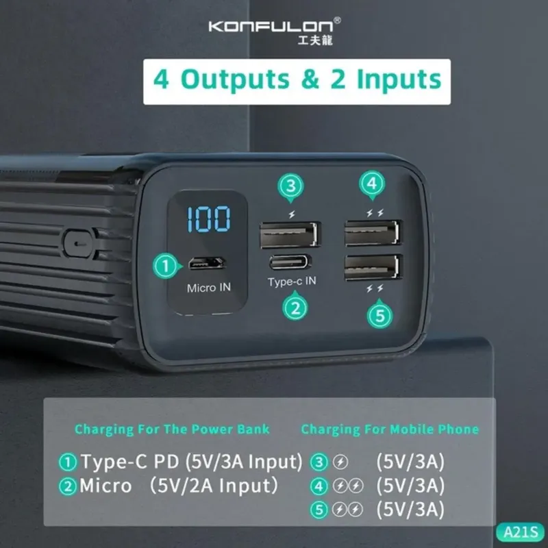 Модель: A21S Количество выходов: 4 Количество входов: 2 Входи: USB Type-C PD – 5V/3A Micro-USB – 5V/2A Выходы: 4 × USB-A – до 5V/3A Дисплей: цифровой LED индикатор заряда Портативный аккумулятор Konfulon – это надежное и универсальное решение для одновременной зарядки нескольких устройств. Модель оснащена 4 USB выходами, позволяющими заряжать смартфоны, планшеты, наушники и другие гаджеты одновременно. Поддержка Type-C PD обеспечивает быструю и стабильную зарядку самого powerbank'а. Удобный LED дисплей отображает точный уровень заряда в процентах, а прочный корпус гарантирует долговечность в ежедневном использовании. Powerbank отлично подойдет для дома, работы, путешествий и ситуаций, когда необходимо заряжать несколько устройств одновременно. Преимущества: 4 USB выхода для одновременной зарядки нескольких устройств 2 входа: Type-C PD + Micro USB Выходная мощность до 5V/3A Цифровой LED индикатор уровня заряда Надежный и стильный дизайн Совместим с большинством современных гаджетов