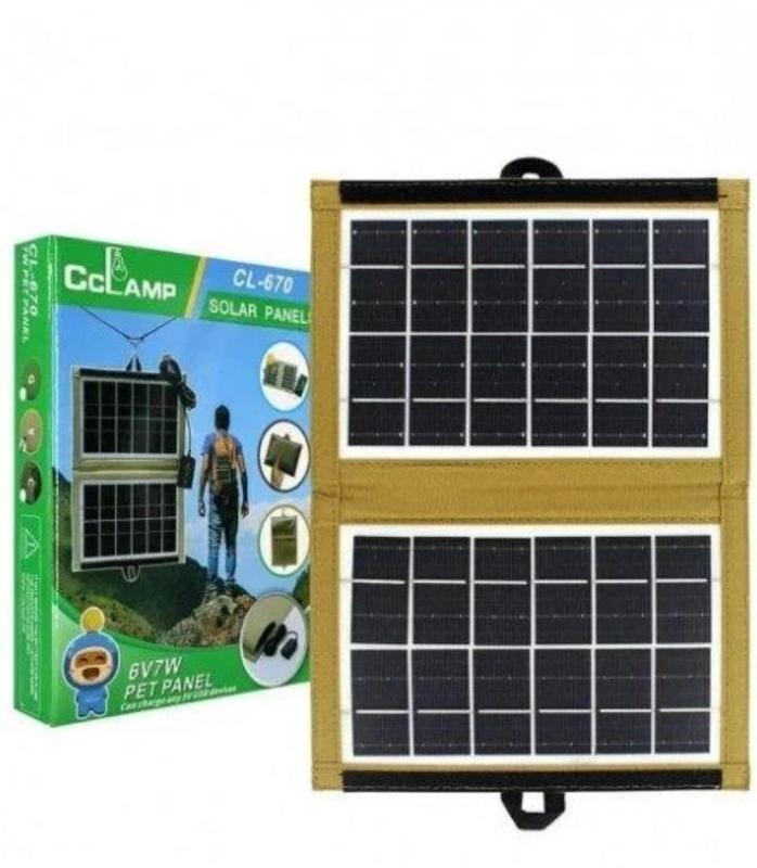 Солнечная панель CL-680 подходит для зарядки любого мобильного телефона или устройства, заряжаемого от 5 В, например планшета, камеры, повербанка и т.д. С помощью многоканальной головки можно подключить кабель к порту USB. Панель не имеет встроенной батареи, она производит энергию от солнечного света. Использование: поместите панель в солнечное место. Отрегулируйте панель, чтобы максимизировать мощность (вставьте панель перпендикулярно солнечному свету под углом от 45° до 90°). Подключите солнечную панель к устройству с помощью USB кабеля. Солнечная энергия экологична и экономит энергию! Характеристики: Мощность: 7 Вт; максимальное напряжение: 6 В; максимальное напряжение мощности (Vpm) 6V; максимальный ток мощности (имп) 1,3 А; напряжение разомкнутой цепи (Voc) 11 В; Ток короткого замыкания (Isc) 0. 6 А; Высота: 29 см/27 см; Ширина: 20 см/16 см;