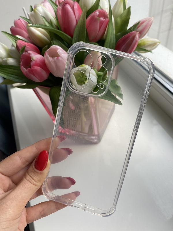 Прозорий силіконовий чохол з захистом камери та протиударними кутами для iPhone 13 про Макс м'який на дотик, кришталево прозорий, в упакуванні, довго не жовтіє. Ідеально сидить на телефоні. Відправлення щоденно Новою поштою або Укрпоштою, є безпечна оплата шафа.