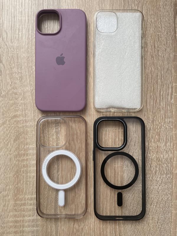Чохли з міцного силікону, протиударні, в ідеальному стані Верхній ряд на айфон 14 Ліловий/пурпуровий - 120 Прозорий з блискітками - 120 Нижній ряд Прозорий чохол з білою оригінальною накладкою від MagSafe на 14 pro - 350 Прозорий з чорною накладкою від MagSafe на 14 pro max - 140 В наявності також чохли на інші моделі, заходьте, дивіться😊