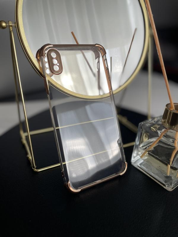 Новий стильний чохол для iPhone Xs Max з силікону. Прозорий з золотими деталями контуру. Захищає повністю телефон та надає додаткового захисту по кутам. Зручно сидить у руці та має приємну глянцеву поверхню.