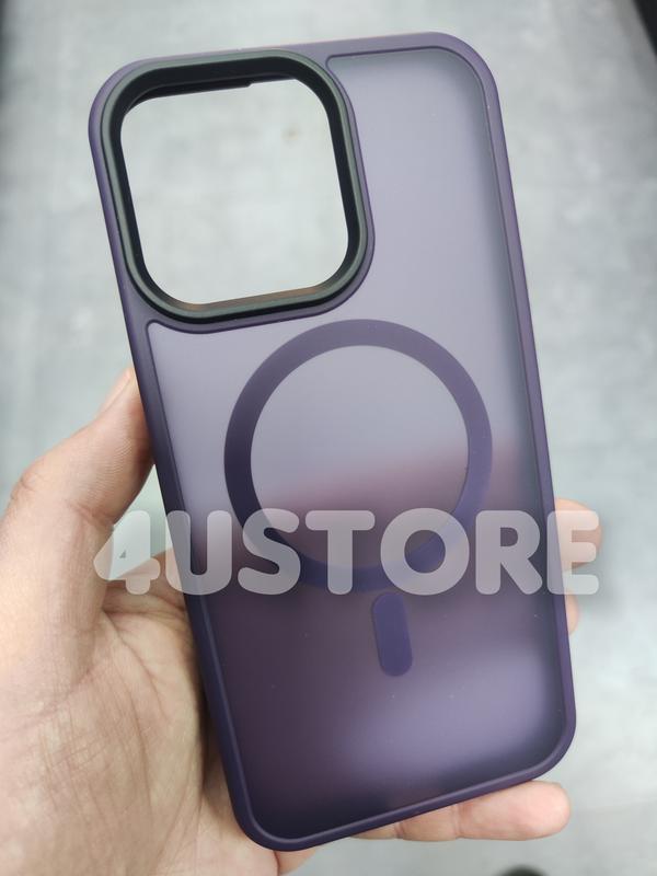 чехол премиум класса Metal Buttons with Magsafe, для iPhone 15 Pro Max цвет Deep Purple идёт в картонной упаковке, хороший вариант на подарок бортик силиконовый спинка матовая кнопки металл есть бортик вокруг блока камеры есть бортик вокруг экрана