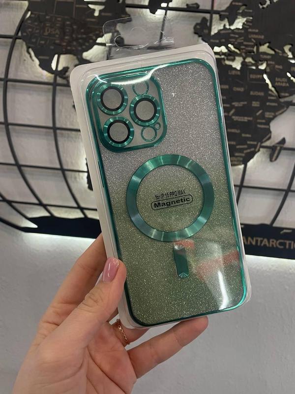 Силиконовый чехол с закрытой камерой для iPhone 15 Pro Max,Чехол с поддержкой MagSafe для Айфон 15 Про Макс (зеленый с блестками) Накладка Sides Chrome Case Magsafe Box представляет собой стильный и защитный аксессуар, специально разработанный для смартфонов iPhone с поддержкой технологии MagSafe. Эта накладка сочетает элегантный дизайн с высокой функциональностью, обеспечивая надежную защиту вашего устройства. Основные характеристики: Совместимость с технологией MagSafe: Накладка имеет магнитные элементы, позволяющие ей прочно крепиться к вашему iPhone, совместимому с технологией MagSafe. Это обеспечивает легкость использования различных аксессуаров, таких как зарядные беспроводные устройства, держатели и другие. Прочная защита: Sides Chrome Case Magsafe Box обеспечивает надежную защиту от ударов, царапин и пыли, помогая сохранить ваш iPhone в идеальном состоянии. Удобная посадка и качественные материалы обеспечивают устойчивость к повседневным повреждениям. Элегантный дизайн: Накладка имеет изысканный и современный дизайн с хромированными элементами, придающими эстетическое очарование вашему iPhone. Она придает устройству уникальный стиль и делает его выделяющимся среди других. Легкий доступ ко всем функциям: Все порты, кнопки и функциональные элементы остаются легко доступными при использовании этой накладки. Вы не можете заряжать устройство, регулировать громкость и использовать камеру, не снимая накладку. Продуманный дизайн: Накладка имеет точно вырезанные отверстия для камер, динамиков и микрофонов, что позволяет максимально эффективно использовать все функции вашего iPhone без вмешательства в качество звука и изображения. С накладкой Sides Chrome Case Magsafe Box вы получаете идеальное сочетание стиля и защиты вашего iPhone. Она придаст индивидуальности вашему устройству и обеспечит надежную защиту в повседневных ситуациях.