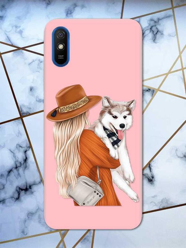 Матовый чехол с розовыми боками на xiaomi redmi 9а :: девушка с собачкой (принт 115)