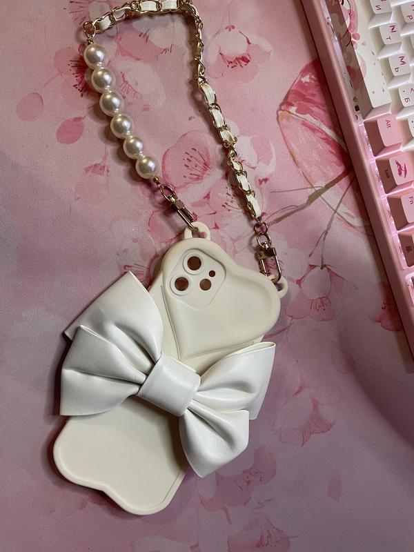Чехол на iPhone 12, целый, новый. Бант из искусственной кожи, сам чехол силиконовый, мягкий и приятный на ощупь. Ручка с жемчужинами снимается