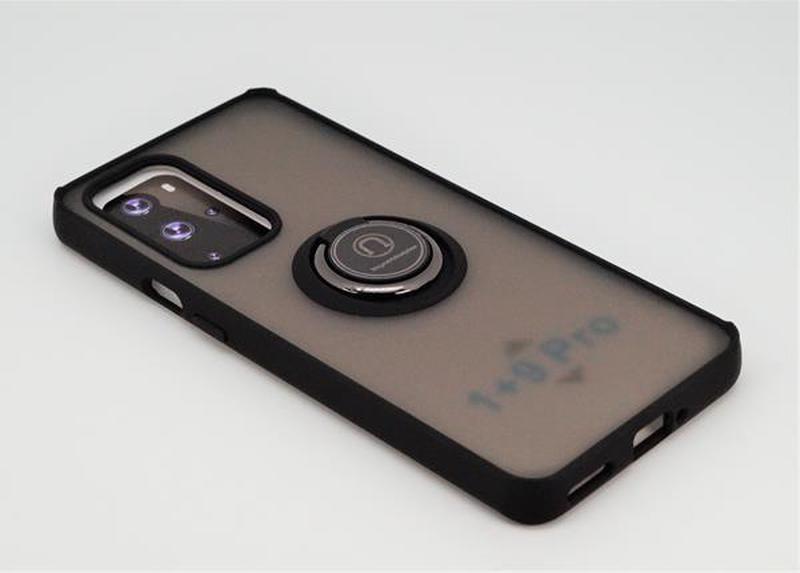 Защитный чехол-бампер для OnePlus 9 Pro, с кольцом - держателем на палец, со встроенной металлической пластиной (подходит для крепления на магнитный держатель в авто), все отверстия точно по месту, чехол хорошо держится в руке, не скользит, бортик прочный и надёжно защитит телефон. Чехол в черном цвете с черными кнопками.
