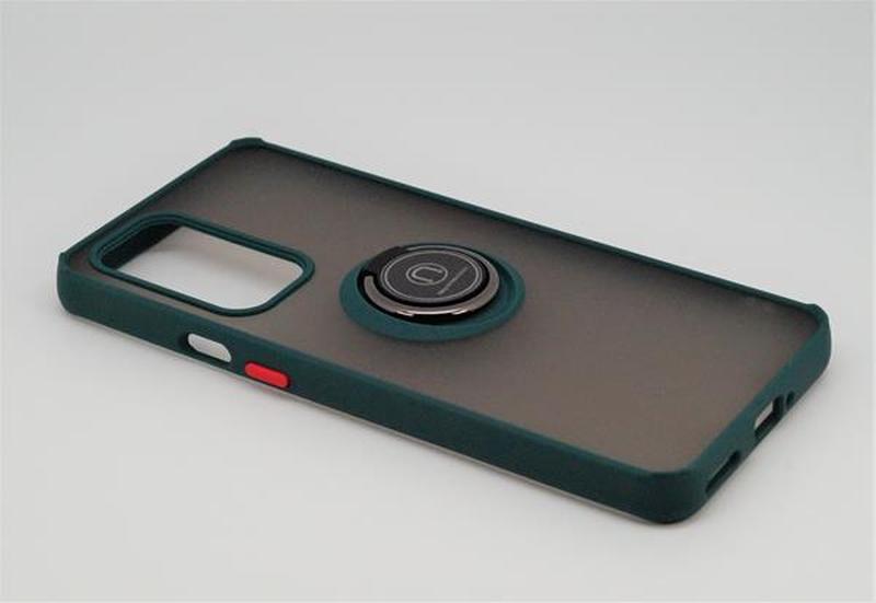 Защитный чехол-бампер для OnePlus 9 Pro, с кольцом - держателем на палец, со встроенной металлической пластиной (подходит для крепления на магнитный держатель в авто), все отверстия точно по месту, чехол хорошо держится в руке, не скользит, бортик прочный и надёжно защитит телефон. Чехол в темно-зеленом цвете с красными кнопками.