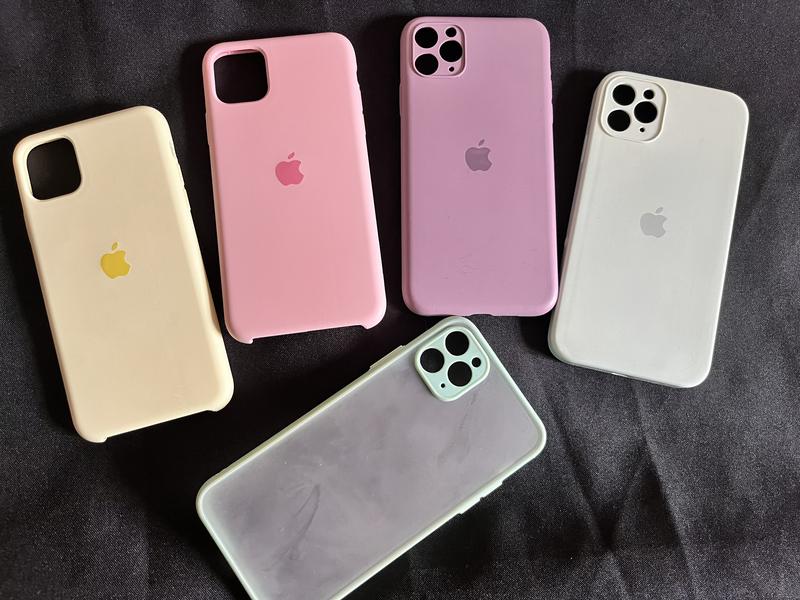 Чехлы на iPhone11 Pro Max Желтый, прозрачный и розовый чехлы в хорошем состоянии. На фиолетовом-чуть-чуть надорвано возле кнопки. На зеленом небольшие вздутости. Все вместе - 100