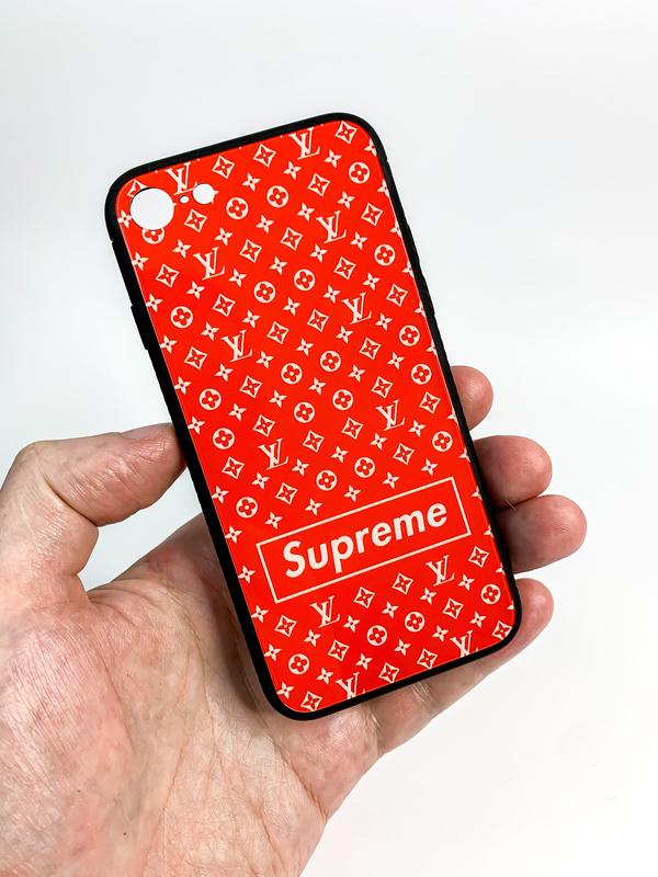 Чохол для iPhone 7/8 Комбинированный чехол из черного полиуретана + стеклянная тыльная панель с принтом Закрытый низ Цвет: красный Распродажа остатков чехлов. Чехлы все новые Все представленные фото живые, сделанные нами