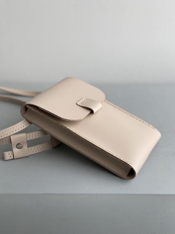 Сумка виготовлена з натуральної шкіри бежевого кольору. Має одне основне відділення і кишеню для дріб'язку на задній стінці. Сумка закривається на магніт. Довжину ручки можна регулювати. Розмір 18*11*3 см. Можливо виготовити в іншому кольорі на замовлення.