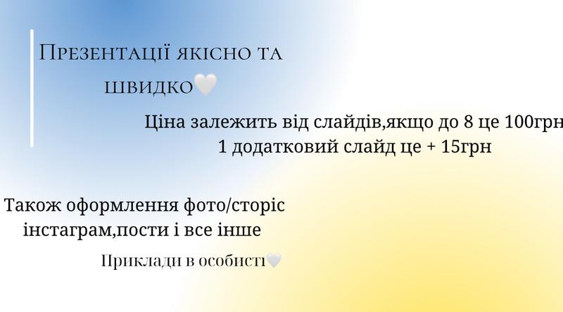 Презентации быстро и качественно,цена до 8 слайдов 100грн каждый дополнительный + 15грн Срок выполнения зависит от объема,в большинстве до 2 часов, если идёт от 10 слайдов то до 3-4