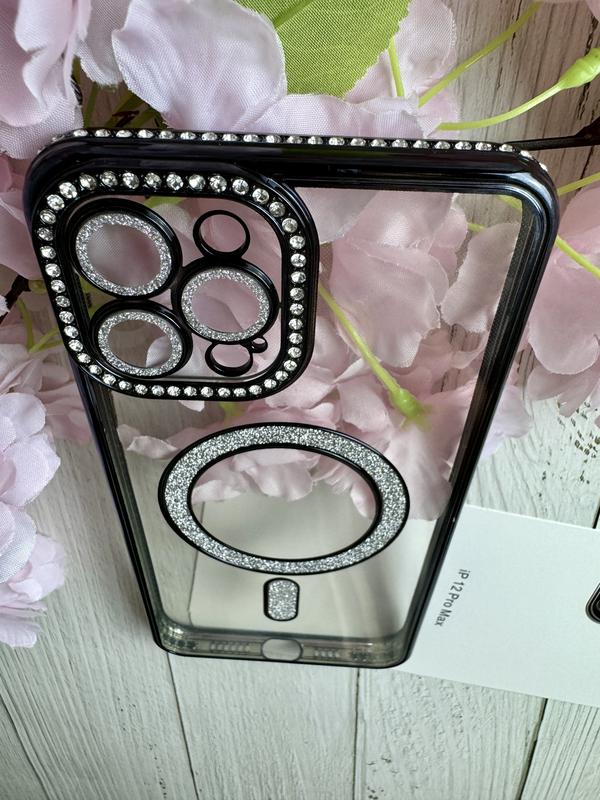 Красивый и очень блестящий чехол с камушками. Имеет квадратные бортики, плотно одевается на телефон. Камешки крепко держатся! Линзы на камеру с блестками приклеены, по желанию их можно снять. Поддерживает зарядку MagSafe. На одной из сторон то не выпавшими камушками, а отверстия для брелков или ремешков. На 12pro max айфон есть еще бронзовый, синий и фиолетовый цвета. Цены актуальны только для сайта Шкаф