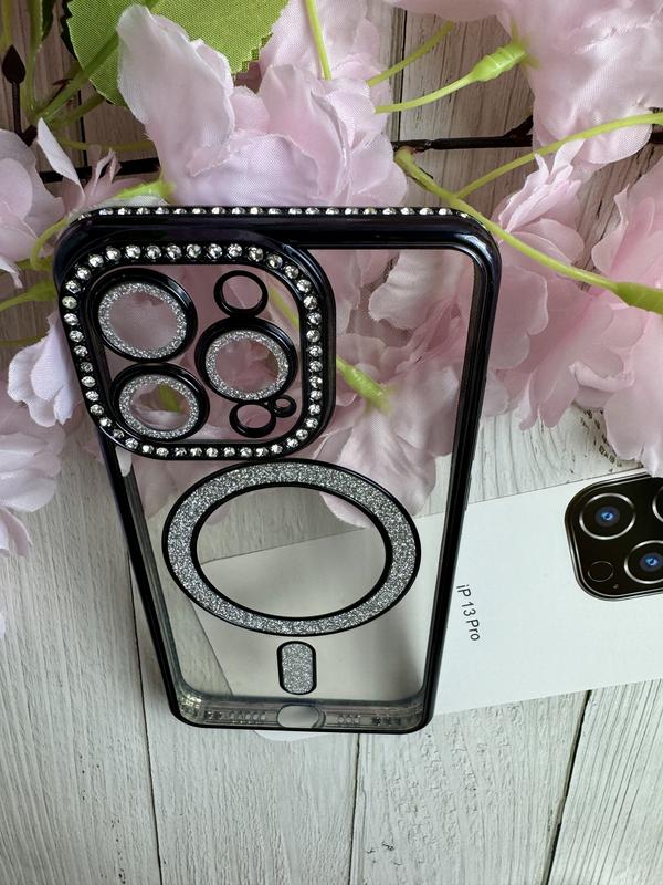 Красивый и очень блестящий чехол с камушками. Имеет квадратные бортики, плотно одевается на телефон. Камешки крепко держатся! Линзы на камеру с блестками приклеены, по желанию их можно снять. Поддерживает зарядку MagSafe. На одной из сторон то не выпавшими камушками, а отверстия для брелков или ремешков. На 13pro айфон есть еще золотистый и серебристый цвета. Цены актуальны только для сайта Шкаф