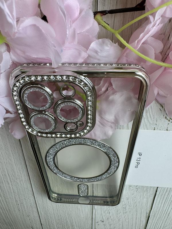 Красивый и очень блестящий чехол с камушками. Имеет квадратные бортики, плотно одевается на телефон. Камешки крепко держатся! Линзы на камеру с блестками приклеены, по желанию их можно снять. Поддерживает зарядку MagSafe. На одной из сторон то не выпавшими камушками, а отверстия для брелков или ремешков. На 13pro айфон есть еще золотистый и черный цвета. Цены актуальны только для сайта Шкаф