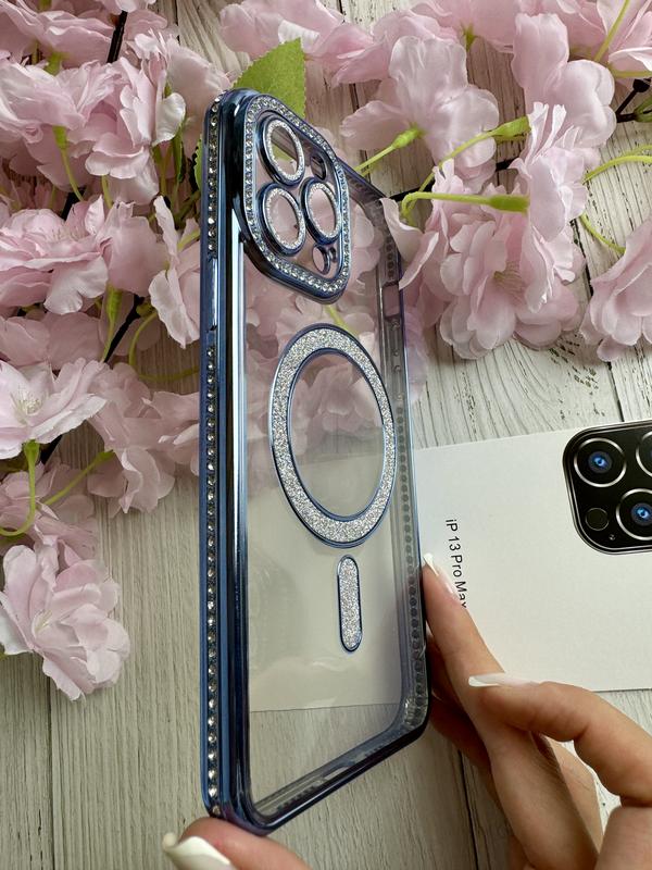 Красивый и очень блестящий чехол с камушками. Имеет квадратные бортики, плотно одевается на телефон. Камешки крепко держатся! Линзы на камеру с блестками приклеены, по желанию их можно снять. Поддерживает зарядку MagSafe. На одной из сторон то не выпавшими камушками, а отверстия для брелков или ремешков. На 13pro max айфон есть еще бронзовый, фиолетовый и черный цвета. Цены актуальны только для сайта Шкаф