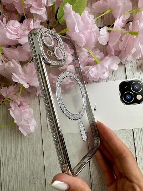 Красивый и очень блестящий чехол с камушками. Имеет квадратные бортики, плотно одевается на телефон. Камешки крепко держатся! Линзы на камеру с блестками приклеены, по желанию их можно снять. Поддерживает зарядку MagSafe. На одной из сторон то не выпавшими камушками, а отверстия для брелков или ремешков. На 15 айфон есть еще бронзовый, фиолетовый и золотистый цвета. Цены актуальны только для сайта Шкаф