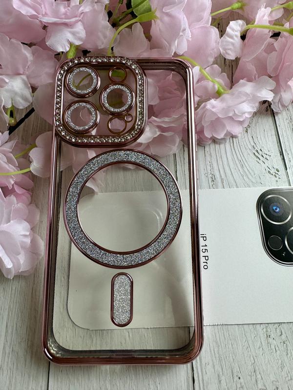 Красивый и очень блестящий чехол с камушками. Имеет квадратные бортики, плотно одевается на телефон. Камешки крепко держатся! Линзы на камеру с блестками приклеены, по желанию их можно снять. Поддерживает зарядку MagSafe. На одной из сторон то не выпавшими камушками, а отверстия для брелков или ремешков. На 15 pro айфон есть еще фиолетовый, серебристый, черный, и золотистый цвета. Цены актуальны только для сайта Шкаф