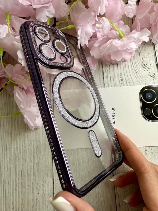 Красивый и очень блестящий чехол с камушками. Имеет квадратные бортики, плотно одевается на телефон. Камешки крепко держатся! Линзы на камеру с блестками приклеены, по желанию их можно снять. Поддерживает зарядку MagSafe. На одной из сторон то не выпавшими камушками, а отверстия для брелков или ремешков. На 15 pro айфон есть еще бронзовый, серебристый, черный и золотистый цвета. Цены актуальны только для сайта Шкаф