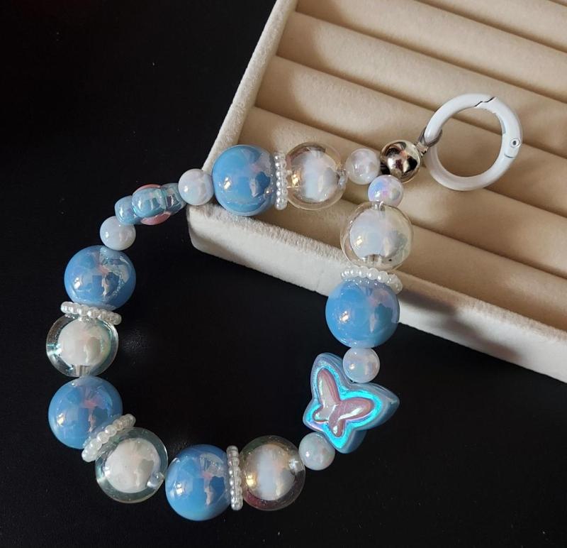 Брелок - браслет для телефона, ключей, сумки современная акцентная, эффектная и яркая модель уместно и удобно выполнена формой петельки На основе бижутерного сплава большие бусины голубого, белого и прозрачного цветов крепеж - карабин диаметром 2 см диаметр бусин 1.6 - 1.4 см длиной браслет - 15 см