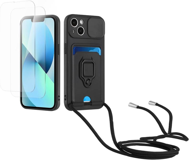 Чехол для iPhone 15+ от Kaslly комплект: силиконовый чехол (слоты для карт, 360°, магнитное кольцо, защита камеры, шнур) 2 закаленных стекла салфетки для наклеивания стекла цвет черный качество супер