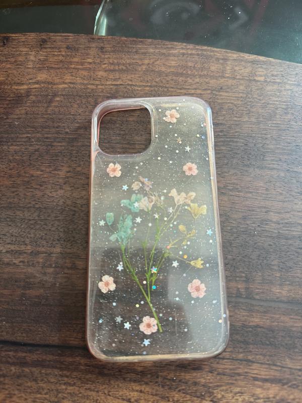 чехол на iPhone 13 mini с эпоксидной смолой, блестками и натуральными засушенными цветами)