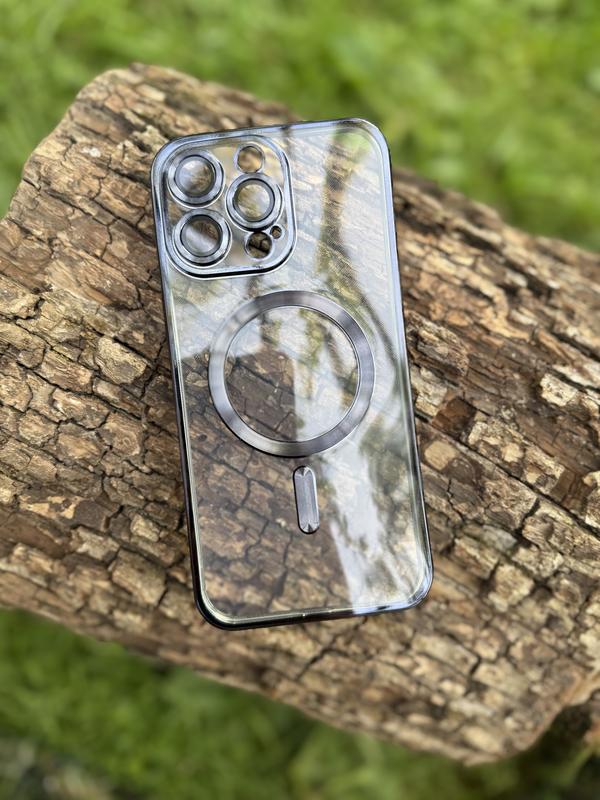 Прозорий чохол з MagSafe для iPhone 15 Pro Max із насиченим чорним відтінком. Має скляний захист лінз камер — за бажанням його можна зняти. Щільно прилягає, захищає кути та підкреслює строгий стиль телефону.